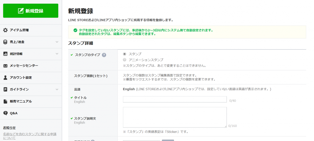 LINEクリエイターズマーケットから「新規登録」ボタンを押し、まずはスタンプの詳細を入力します。