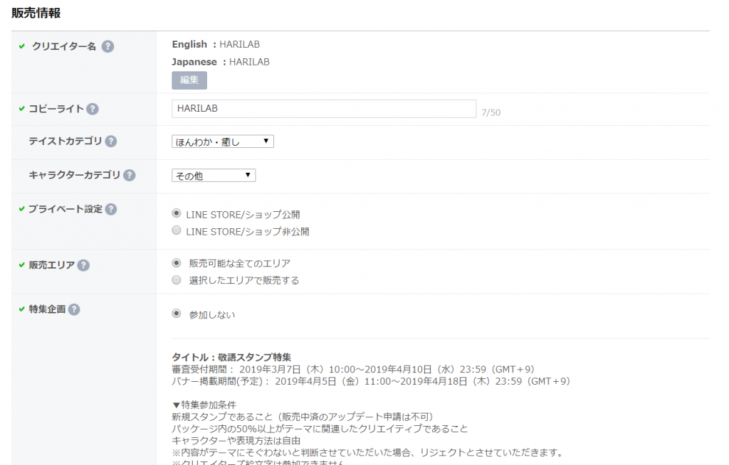 スタンプのタイトルと説明文は英語必須、日本語はオプションです。