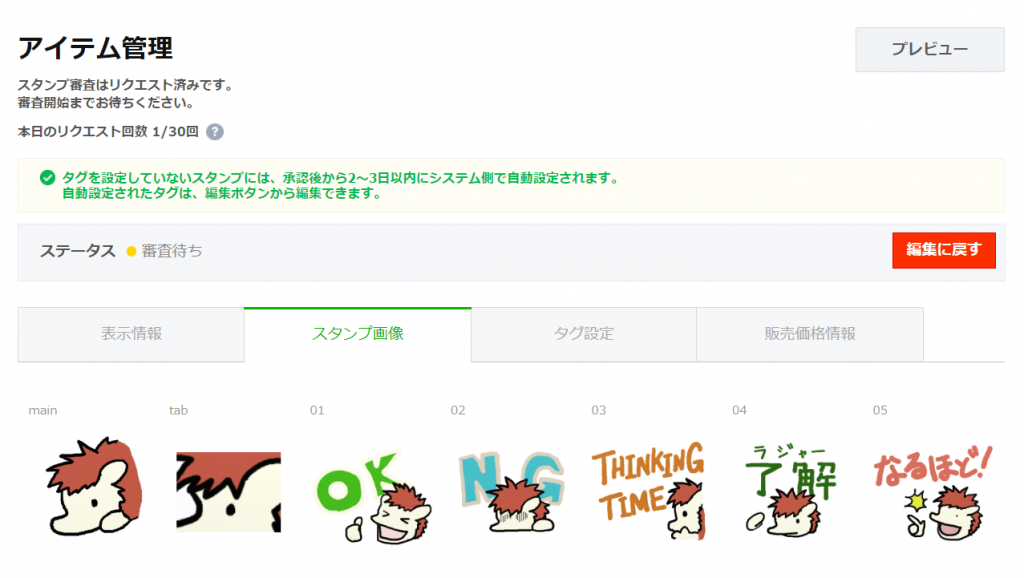 この期間はLINEの内部の方が申請したスタンプがガイドラインに則っているかを審査しています。