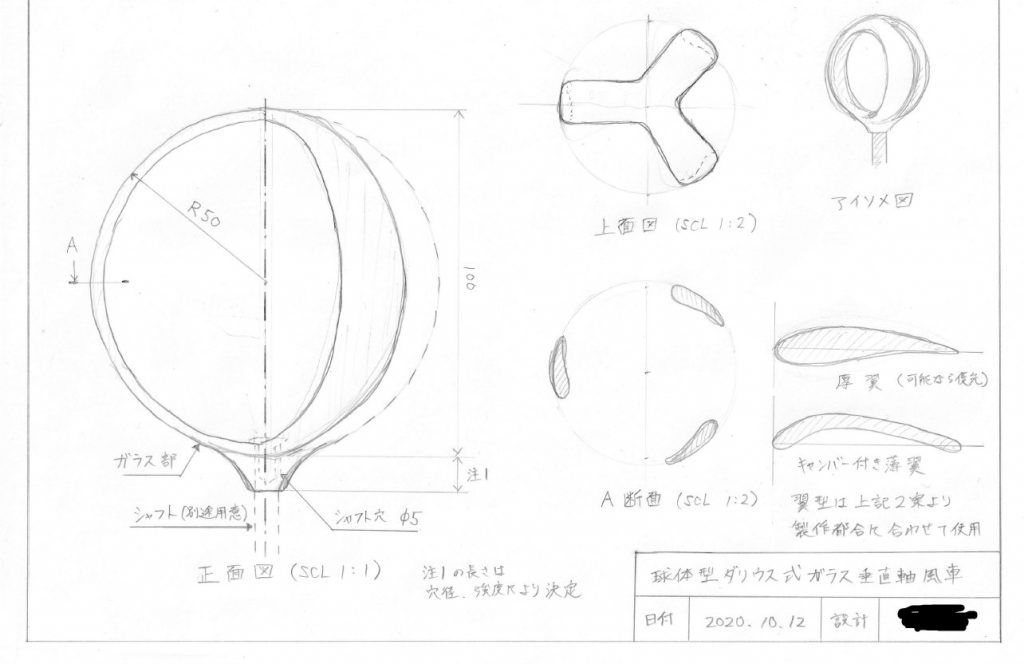 曲げ加工が容易であることから、綺麗な球体の風車をつくれないかと思い設計したのがこちらの図面です。