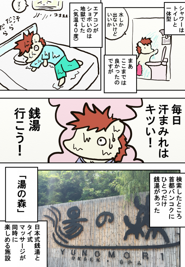 人口の多いバンコクはいつも賑わっています。春でも体を貫くような日差しと気温、そして人混みのやかましさから逃れることができるオアシスがこの「湯の森」です。