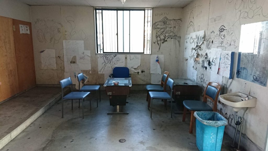 おびただしいラクガキとなぜか大量にある椅子が雰囲気を作っています。