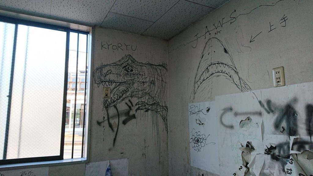自販機センターピッコロの内装はボロボロの壁にラクガキだらけ。
