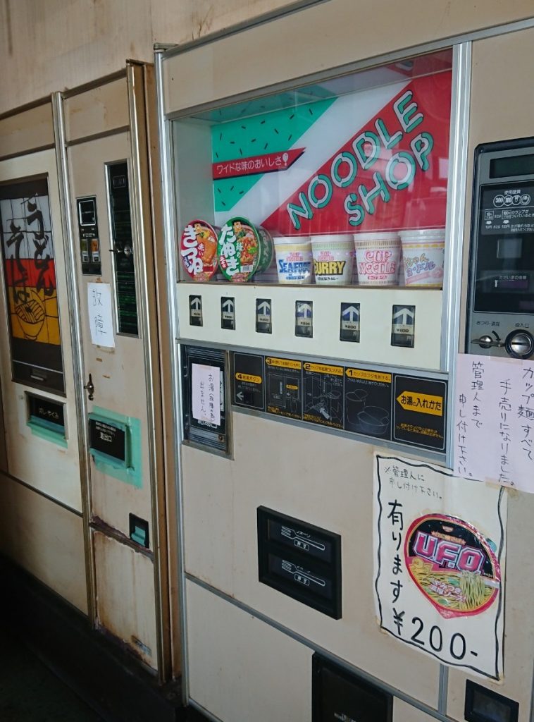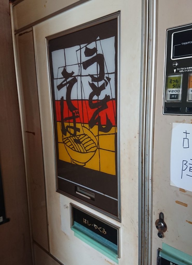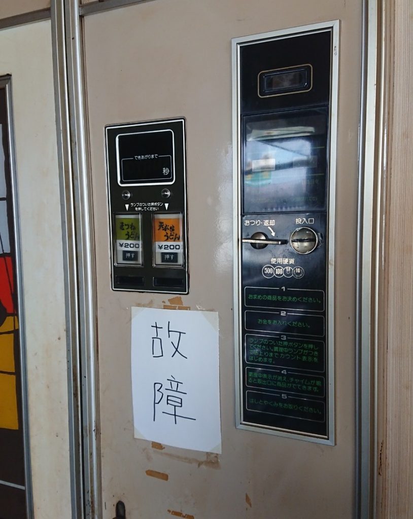 ひとつ隣に設置されているきつねうどん、天ぷらうどんの自販機は故障中。